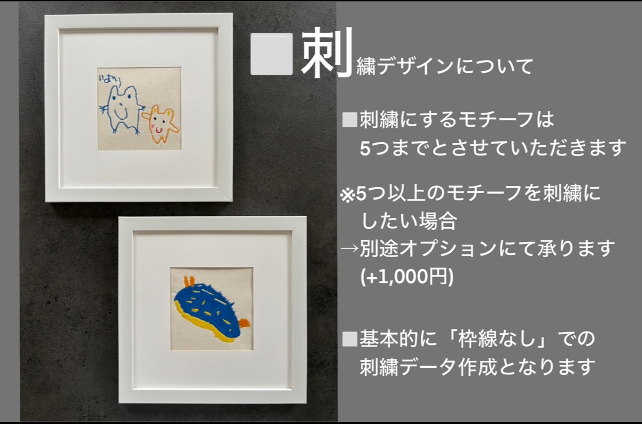 お子様が楽しく描いた作品を刺繍でしっかりと形にすることで、貴重な思い出として長くお楽しみいただけます。アートを通じて、心豊かな時間をお過ごしください