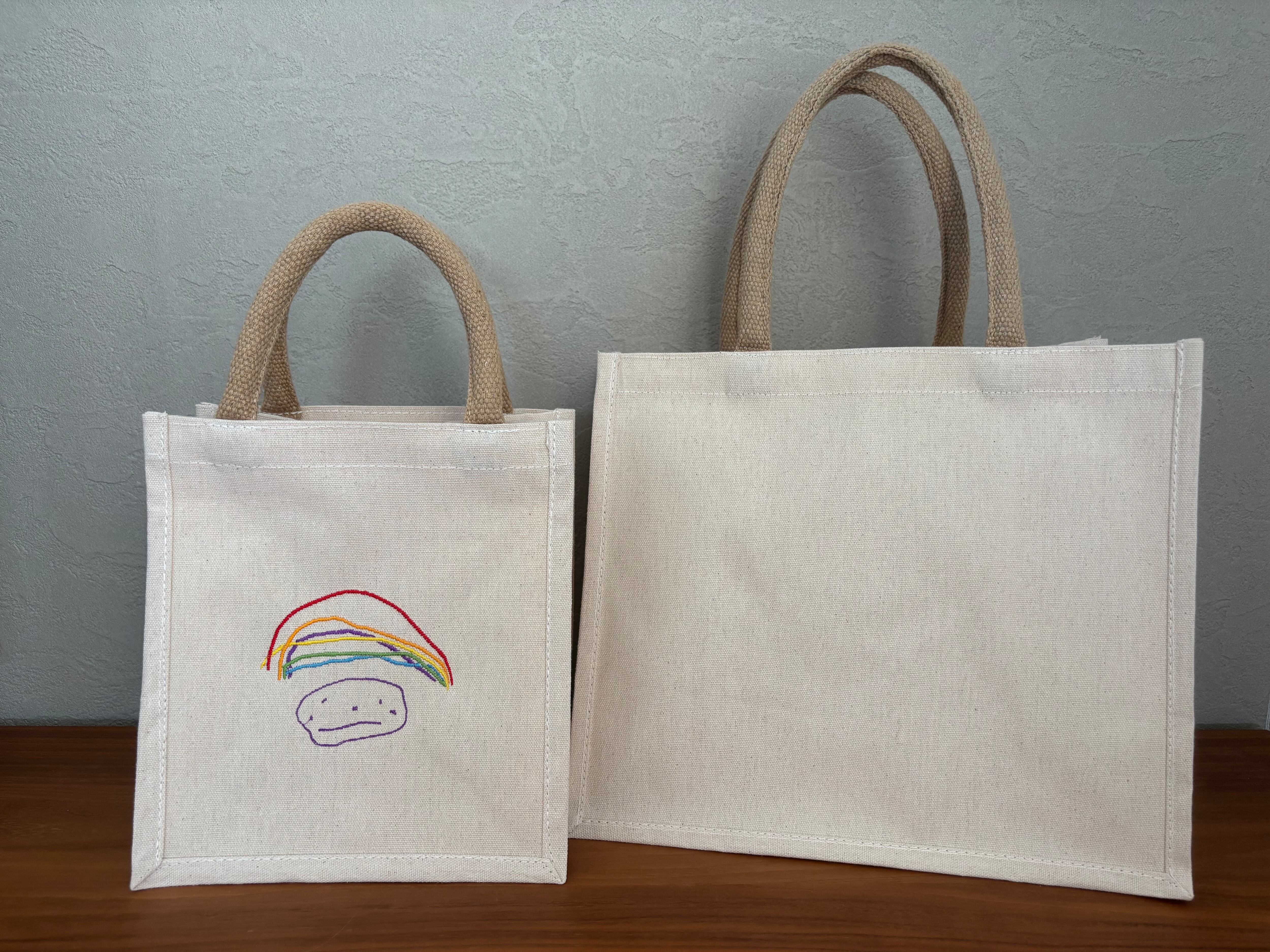 お子様の想像力を育むための、お絵かき刺繍が楽しめる特別なコットンバックです。個性的なデザインを刺繍にした作品をお仕立ていたします。